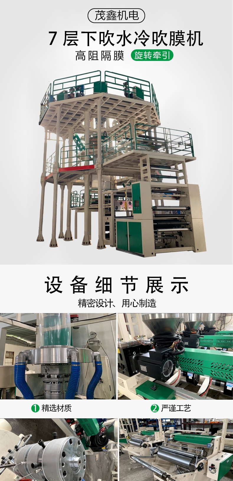 廣東茂鑫的7層共擠下吹水冷高阻隔膜吹膜機組,整機緊湊,低耗,智能,更加貼合