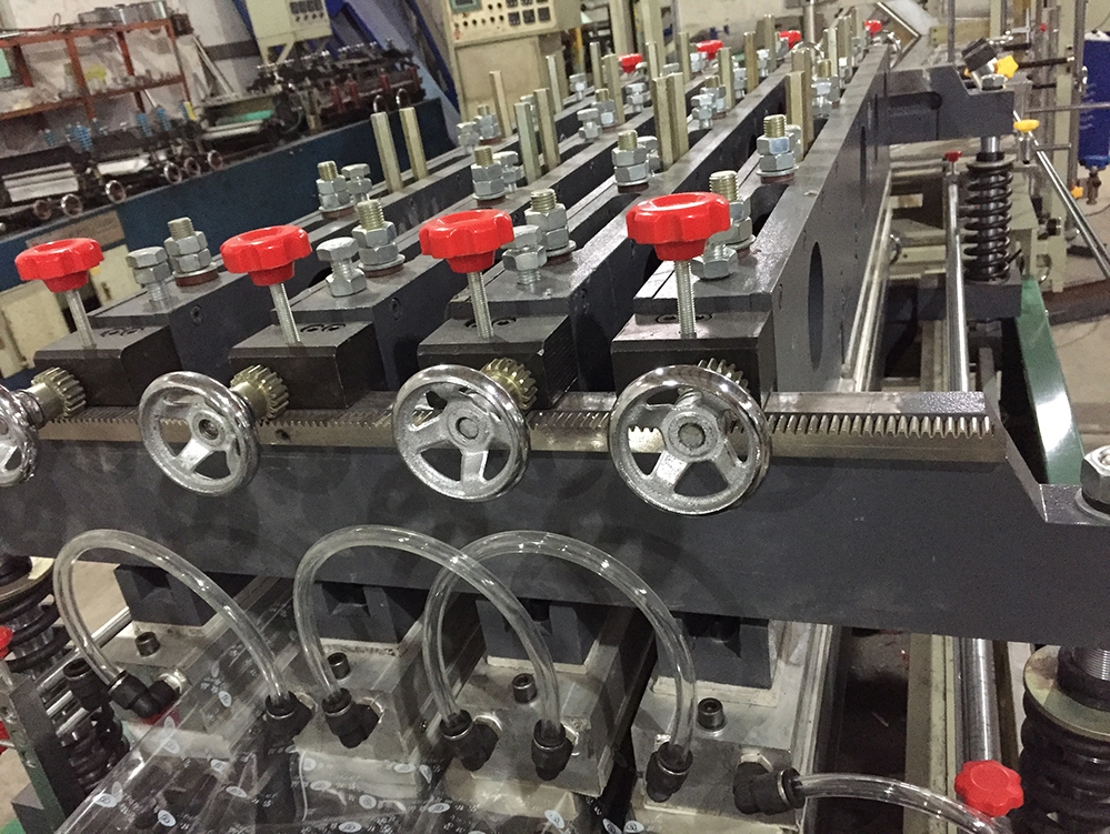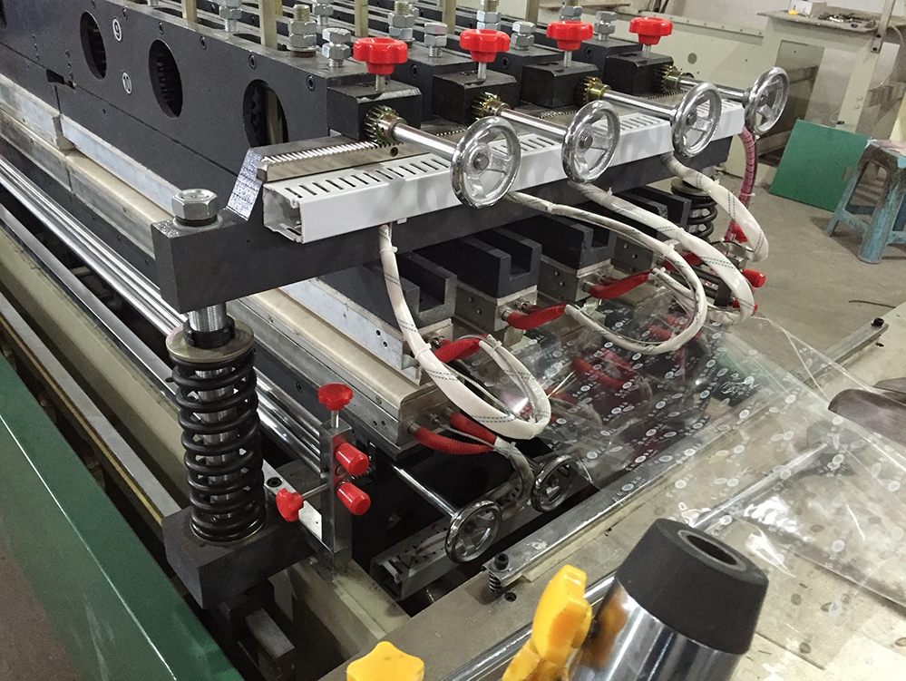 | 配有收料輸送裝置,多排袋分切裝置,配用固定切刀可移動,可微調(diào)切刀前后、斜度位置。