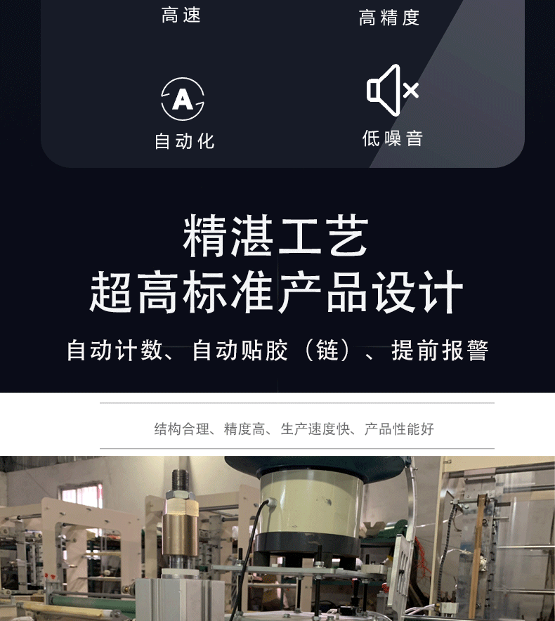 * 本機(jī)備有氣動打孔,氣動沖手挽,超聲波封口等功能,操作方便簡單、速度快、生產(chǎn)的產(chǎn)品尺寸精確,封線牢固美觀,質(zhì)量穩(wěn)定,自動化程度高的特點(diǎn)。